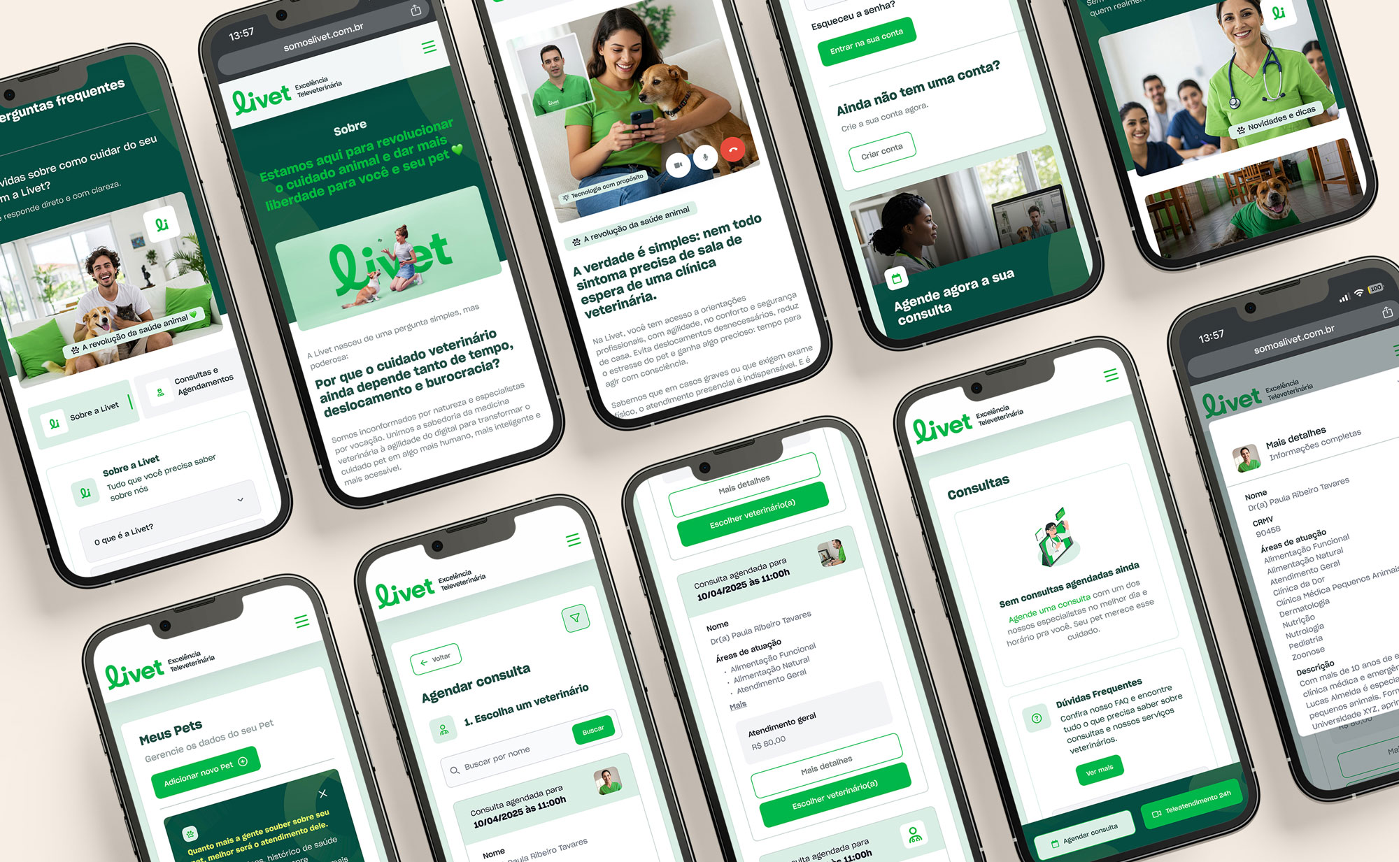 Criar uma marca do zero é sempre um grande desafio, e com a Livet, ele foi ainda mais ambicioso: construir uma empresa digital de saúde televeterinária, com base sólida em branding estratégico e uma experiência digital de excelência. Nosso papel foi estruturar o negócio desde a base, construindo uma marca autêntica e relevante e, ao mesmo tempo, criando uma plataforma digital completa, que conectasse tutores e veterinários com facilidade, empatia e excelência técnica.