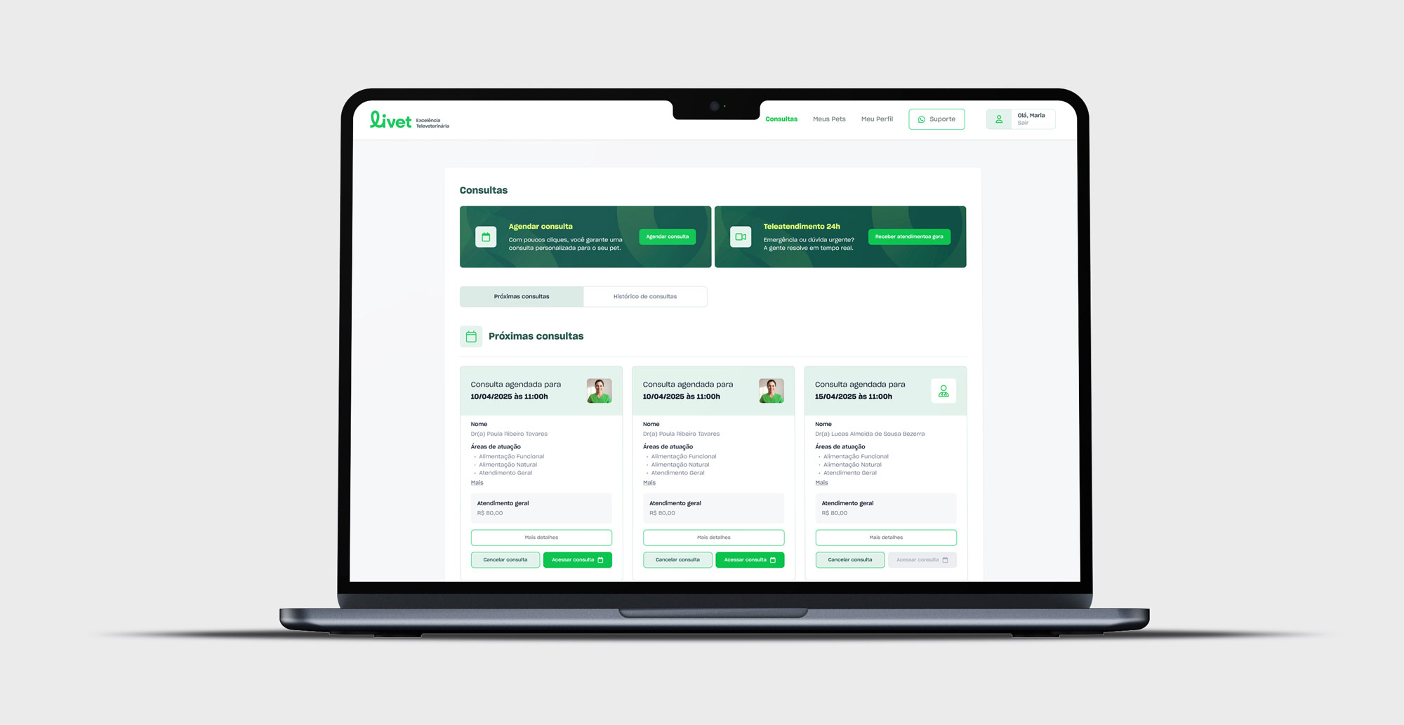 Com a estratégia clara, iniciamos o desenvolvimento do produto digital completo da Livet. Cada etapa foi planejada para entregar uma experiência fluida e funcional, tanto para o tutor quanto para os profissionais da saúde animal.