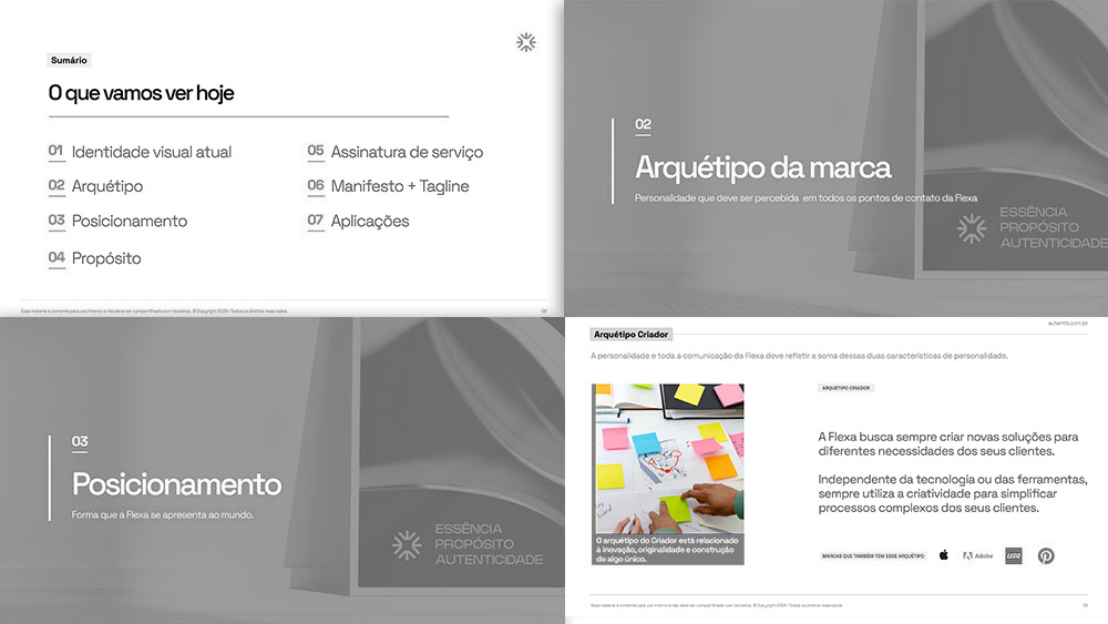 O desafio era transmitir uma identidade flexível, inteligente e moderna. Para isso, explorei elementos visuais e verbais que traduzissem a essência da marca, tudo trabalhando colaborativamente com o cliente.